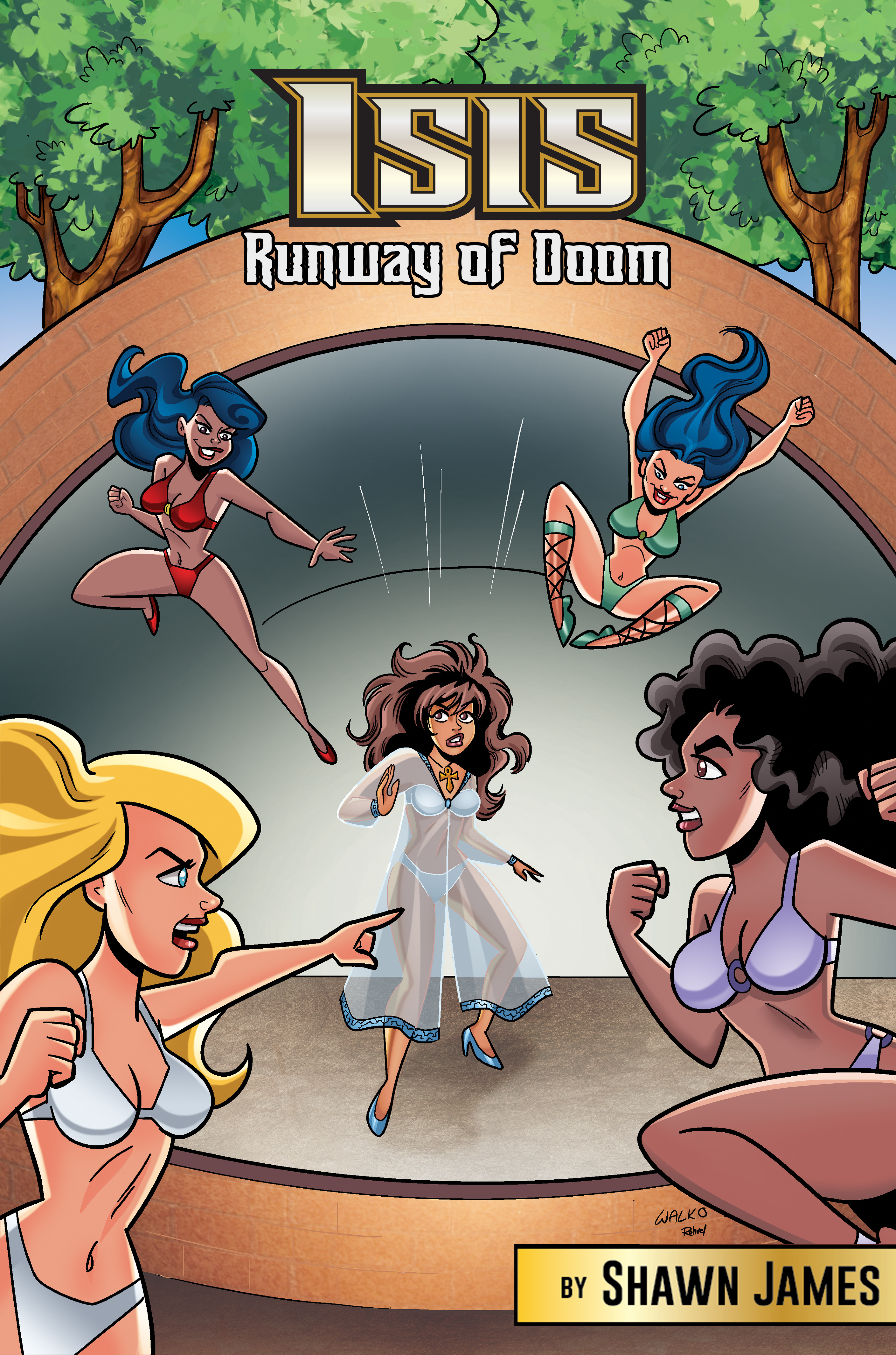 Isis Runway of Doom features a cover by Bill Walko and a pair of pin-ups by Darth Sarchs and is a Fun story featuring Isis entering the world of modeling as she takes on Golden Shine and her Glamazons.